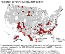A 2009 U.S. federal law defined a persistent poverty county as one in which "20 percent or more of its population [has lived] in poverty over the past 30 years" according to the Census, which is done every 10 years.[1] The Economic Research Service (ERS) of the U.S. Department of Agriculture categorizes non-metropolitan counties by their dominant economic foundation and by characteristic policy type. Persistent poverty counties are defined as those where 20% or more of the county population in each of the last four decennial Censuses had poverty level household incomes.[2]