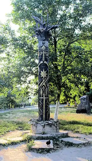 The hole in the centre of the circle is interpreted by Sedov as a groove for the wooden idol.[15] He found pieces of putrefied wood inside the hole[15] and argues in his report: the data from the Novgorod First Chronicle are confirmed, and the idol was hacked down during the process of destruction, leaving the base of the idol inside the hole.[1] Sedov in his survey draws a more complete and detailed picture of the destruction.[1] Based on the results of the excavations he claims: while one group of people was engaged in chopping the wooden idol down, another was covering the bonfires with soil and destroying the altar.[1] Then they all together buried the ditch.[1]