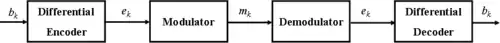The received signal is demodulated to yield and then the differential decoder reverses the encoding procedure and produces