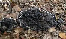 The fruit bodies of Phellodon species have caps and stipe, and thus fall into the general category "stipitate hydnoid fungi". The cap surfaces are initially velvety to tomentose, eventually becoming matted. The surface is rough, with pits and ridges, and sometimes with concentrical zones of color or texture. The color can vary considerably, from cream to yellowish, brownish, greenish, greyish or black.[15] Neighboring fruitbodies can fuse together, forming intertwined caps and partially fused stipes.[16] Alexander H. Smith wrote of P. tomentosus, "It often occurs in large mats of fused caps almost producing a ceiling over large areas of the moss under conifers."[17] Phellodon fruitbodies can envelop nearby grass or twigs. The stipe is thickly tomentose or smooth, typically the same color as the cap or darker.[18] In P. niger, the outer covering of the stipe is a thick felty layer of mycelium that absorbs water like a sponge.[19] The hymenophore (the fertile, spore-bearing surface) is on the underside of the cap. The spines become grey at maturity.[18] In conditions of high humidity, P. niger can form striking drops of black liquid on the actively growing caps.[19]