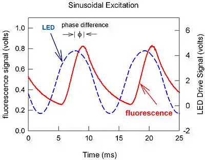 If the excitation source is periodic rather than pulsed, then the time response of the luminescence is correspondingly different. For instance, there is a phase difference between a sinusoidally varying light emitting diode (LED) signal of frequency f and the fluorescence that results (see figure). The phase difference varies with decay time and hence temperature as:
