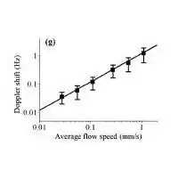Figure 2 shows a relationship between average flow velocity and the experimental photoacoustic Doppler frequency shift. In a scattering medium, such as the experimental phantom, fewer photons reach the absorbers than in an optically clear medium. This affects the signal intensity but not the magnitude of the frequency shift. Another demonstrated feature of this technique is that it is capable of measuring flow direction relative to the detector based on the sign of the frequency shift.[2] The reported minimum detected flow rate is 0.027 mm/s in the scattering medium.[3]