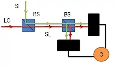 Schematic of the homodyne intensity correlation scheme described in [6]. SI, signal field, LO, local oscillator, BS, beam splitter, SL, superimposed light, C, correlator. The photodetectors (black elements) send electrical signals to the correlator where the intensity correlation is measured.