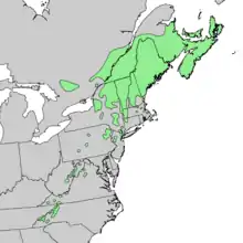 It is closely related to black spruce, and hybrids between the two are frequent where their ranges meet.[3][4][5] Genetic data suggests that the red spruce peripatrically speciated from the black spruce during the Pleistocene due to glaciation.[14][15]