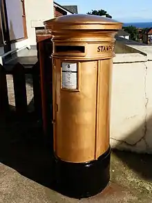 To mark the 2012 Summer Olympics, Royal Mail, Isle of Man Post and Guernsey Post painted a pillar box gold in the home town of each Great Britain team member who won a gold medal, as well as a demonstration model near Westminster Abbey.[15][16] A website mapping the gold boxes was provided. The boxes, originally intended to be repainted to the traditional red in due course, will remain gold painted permanently.[16][17]