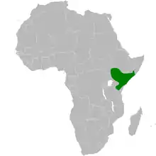 The pink-breasted lark is estimated to have a global extent of occurrence of 560,000 km2, covering a broad range from south-eastern South Sudan and southern Ethiopia through Kenya to southern Somalia, north-eastern Tanzania and eastern Uganda.[1]