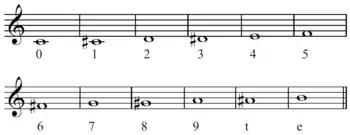 In music, integer notation is the translation of pitch classes and/or interval classes into whole numbers.[5] Thus if C = 0, then C♯ = 1 ... A♯ = 10, B = 11, with "10" and "11" substituted by "t" and "e" in some sources,[5] A and B in others[6] (like the duodecimal numeral system, which also uses "t" and "e", or A and B, for "10" and "11"). This allows the most economical presentation of information regarding post-tonal materials.[5]