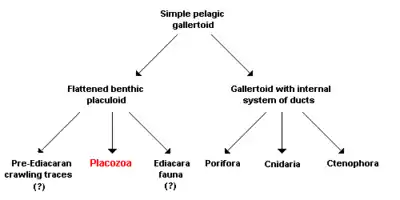 - Other gallertoids, according to this model, made the transition over time to a benthic mode of life; that is, their habitat has shifted from the open ocean to the floor (benthic zone). While the probability of encountering food, potential sexual partners, or predators is the same in all directions for animals floating freely in the water, there is a clear difference on the seafloor between the sides facing toward and away from the substrate, and between their orientation and the vertical direction perpendicular to the substrate. This results naturally in a selective advantage for flattening of the body, as of course can be seen in many benthic species. In the proposed functional-morphology model, the Placozoa, and possibly also several organisms known only from the fossil state, are descended from such a life form, which is now termed placuloid.