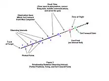 This process of observing, setting the arms on the plotting board, and marking the target's position at the arms' intersection was repeated at the end of each observing interval for the battery. Since the firing of the gun(s) often occurred when the interval bell rang, the interval was also called a firing interval. The interval was usually set at 20 seconds.[note 11] After tracking a target for a short time, there would a string of plotted positions indicated on the board (e.g., the blue circles shown in Figure 1 above, left). This would then be sufficient for the plotting room to "connect the dots" with a projected course line (the black line in Figure 1) and estimate the target's speed.[3]