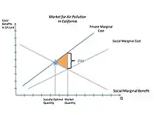 In economics, an externality occurs when the producer does not have to pay its full cost, and when it affects another party either positively or negatively. If the cost to society is greater than the cost the consumer is paying for it, then the externality is negative because it imposes this extra cost on society, which can lead to market inefficiencies. Solving the problem of negative externalities can be costly on its own, as it is often difficult to assign responsibility. Typically, the party who owns the property rights to the polluted area is responsible for paying the cost, but alternative strategies include taxing the producer or collecting payments from a determined group of individuals.[23] California suffers specifically from negative production externalities, which is when a firm's production reduces the well-being of others who are not compensated by the firm.[24]