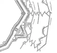 Other European engineers quickly adopted the three-parallel Vauban system, which became the standard method and would prove to be almost infallible.[2] Vauban designed three systems of fortification, each having a more elaborate system of outworks, which were intended to prevent the besiegers from enfilading the bastions. During the next century, other engineers tried and failed to perfect the bastion system to nullify the Vauban type of attack.[3] During the 18th century, it was found that the continuous enceinte, or main defensive enclosure of a bastion fortress, could not be made large enough to accommodate the enormous field armies which were increasingly being employed in Europe, neither could the defences be constructed far enough away from the fortress town to protect the inhabitants from bombardment by the besiegers, the range of whose guns was steadily increasing as better manufactured weapons were introduced.[4][5]