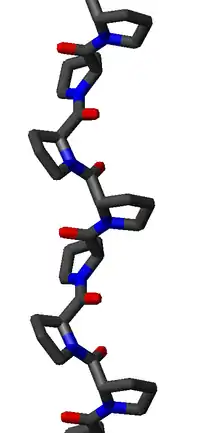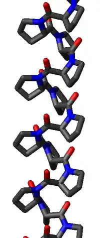 A polyproline helix is a type of protein secondary structure which occurs in proteins comprising repeating proline residues.[1] A left-handed polyproline II helix (PPII, poly-Pro II) is formed when sequential residues all adopt (φ,ψ) backbone dihedral angles of roughly (-75°, 150°) and have trans isomers of their peptide bonds. This PPII conformation is also common in proteins and polypeptides with other amino acids apart from proline. Similarly, a more compact right-handed polyproline I helix (PPI, poly-Pro I) is formed when sequential residues all adopt (φ,ψ) backbone dihedral angles of roughly (-75°, 160°) and have cis isomers of their peptide bonds. Of the twenty common naturally occurring amino acids, only proline is likely to adopt the cis isomer of the peptide bond, specifically the X-Pro peptide bond; steric and electronic factors heavily favor the trans isomer in most other peptide bonds. However, peptide bonds that replace proline with another N-substituted amino acid (such as sarcosine) are also likely to adopt the cis isomer.