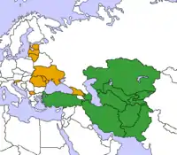 The post-Soviet states, also known as the former Soviet Union (FSU),[1] the former Soviet Republics and in Russia as the near abroad (Russian: бли́жнее зарубе́жье, romanized: blizhneye zarubezhye), are the 15 sovereign states that emerged and re-emerged from the Union of Soviet Socialist Republics following its breakup in 1991, with Russia being the primary de facto internationally recognized successor state to the Soviet Union after the Cold War while Ukraine, by law, proclaimed that it is a state-successor of both the Ukrainian SSR and the Soviet Union which remained under dispute over formerly Soviet-owned properties.[2][3][4] The three Baltic states were the first to declare their independence, between March and May 1990, claiming continuity from the original states that existed prior to their annexation by the Soviet Union in 1940.[5][6] The remaining 12 republics all subsequently seceded.[5] 12 of the 15 states, excluding the Baltic states, initially formed the CIS and most joined CSTO, while the Baltic states focused on European Union and NATO membership.