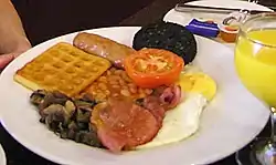 ![]() Potato waffle (far left), as part of a full breakfast | |