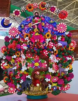 However, Metepec is better known for its more decorative and artistic items. The most important of these are the “tree of life” sculptures which have both religious and decorative functions.[7][8] Originally these were pieces depicting the Garden of Eden story (often depicted with Mexican flora and fauna) but since has developed with various motifs and themes as well as sizes from miniature to monumental.[4] Classic trees of life are three levels, with God depicted in the highest level. The middle level depicts the paradise of Eden and the lower level the fleeing of Adam and Eve from the Garden after their expulsion. The trees are filled in Baroque fashion with a plethora of flowers, birds, animals and more. Depictions of God vary and are sometimes accompanied by angels and other heavenly figures.[4] However, trees have been made with other motifs including secular and historical ones. A Tree of Life with a Virgin of Guadalupe motif is in the Vatican.[8]