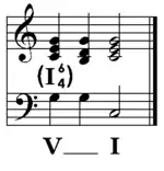 In music theory, a predominant chord (also pre-dominant[3]) is any chord which normally resolves to a dominant chord.[3] Examples of predominant chords are the subdominant (IV, iv), supertonic (ii, ii°), Neapolitan sixth and German sixth.[3] Other examples are the secondary dominant (V/V) and secondary leading tone chord. Predominant chords may lead to secondary dominants.[4] Predominant chords both expand away from the tonic and lead to the dominant, affirming the dominant's pull to the tonic.[5] Thus they lack the stability of the tonic and the drive towards resolution of the dominant.[5] The predominant harmonic function is part of the fundamental harmonic progression of many classical works.[6] The submediant (vi) may be considered a predominant chord or a tonic substitute.[7]