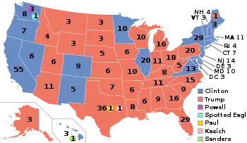 On November 9, 2016, Republicans Donald Trump of New York and Governor Mike Pence of Indiana won the 2016 election, defeating Democrats former Secretary of State Hillary Clinton of New York and Senator Tim Kaine of Virginia. Trump won 304 electoral votes compared to Clinton's 227, though Clinton won a plurality of the popular vote, receiving nearly 2.9 million more votes than Trump. Trump thus became the fifth person to win the presidency while losing the popular vote.[1] In the concurrent congressional elections, Republicans maintained majorities in both the House of Representatives and the Senate.