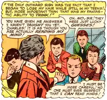 With help from his superhuman powers and natural genius, Xavier becomes an excellent student and athlete, though he gives up the latter, believing his powers give him an unfair advantage. Due to his powers, by the time he graduates from high school, Charles loses all of his hair. He graduates with honors at the age of 16 from Bard College. In graduate studies, he receives Ph.D.s in Genetics, Biophysics, Psychology, and Anthropology with a two-year residence at Pembroke College, University of Oxford.[11] He also receives an M.D. in Psychiatry while spending several years in London.[12][13] He is later appointed Adjunct Professor at Columbia University.[14] Origins of Marvel Comics: X-Men #1 (2010) presents a different version of events, suggesting a scholarship to the University of Oxford rescued him from his abusive home, after which he "never looked back", suggesting he began his academic career as a very young man at Oxford.[15] His stepbrother is resentful of him.