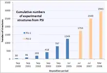The project has been organized into three separate phases. The first phase of the Protein Structure Initiative (PSI-1) spanned from 2000 to 2005, and was dedicated to demonstrating the feasibility of high-throughput structure determination, solving unique protein structures, and preparing for a subsequent production phase.[2] The second phase, PSI-2, focused on implementing the high-throughput structure determination methods developed in PSI-1, as well as homology modeling and addressing bottlenecks like modeling membrane proteins.[3] The third phase, PSI:Biology, began in 2010 and consisted of networks of investigators applying high-throughput structure determination to study a broad range of biological and biomedical problems.[4] PSI program ended on 7/1/2015,[5] even that some of the PSI centers continue structure determination supported by other funding mechanisms.