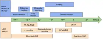 Protein Nuclear Magnetic Resonance (NMR) is able to collect protein structural data by inducing a magnet field through samples of concentrated protein. In NMR, depending on the chemical environment, certain nuclei will absorb specific radio-frequencies.[53][54] Because protein structural changes operate on a time scale from ns to ms, NMR is especially equipped to study intermediate structures in timescales of ps to s.[55] Some of the main techniques for studying proteins structure and non-folding protein structural changes include COSY, TOCSYHSQC, Time relaxation (T1 & T2), and NOE.[53] NOE is especially useful because magnetization transfers can be observed between spatially proximal hydrogens are observed.[53] Different NMR experiments have varying degrees of timescale sensitivity that are appropriate for different Protein Structural changes. NOE can pick up bond vibrations or side chain rotations, however, NOE is too sensitive to pick up Protein folding because it occurs at larger timescale.[55]