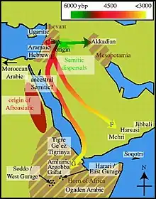 Edward Lipiński believes that support for an African origin is provided by what he describes as a possible relationship between a pre-Semitic Afroasiatic language and the Niger–Congo languages, whose Urheimat probably lies in Nigeria–Cameroon.[9] According to this theory, the earliest wave of Semitic speakers entered the Fertile Crescent via Palestine and Syria and eventually founded the Akkadian Empire. Their relatives, the Amorites, followed them and settled Syria before 2500 BC.[10] Late Bronze Age collapse in Palestine led the southern Semites southwards, where they reached the highlands of Yemen after 20th century BC. Those crossed back to the Horn of Africa between 1500 and 500 BC.[10]