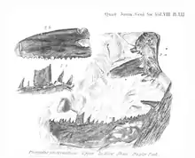 P. problematicus was also used as the designation for an incomplete chelicera discovered in the Welsh Borderland of western England by John William Salter in 1852 but is in modern times considered a nomen vanum ("baseless name") as the species is impossible to define. The fossil material with which it was described is undiagnostic and insufficient to establish any meaningful characteristics and as such many fragmentary pterygotid fossils have been referred to it throughout its long history, rendering it effectively synonymous with the family Pterygotidae. More often than not, these fragments consist of patches of pterygotid integument preserving the scale-like ornamentation characteristic of the group which researchers have wrongfully believed was characteristic of only Pterygotus or P. problematicus. As such ornamentation is known from every pterygotid genus it can not be used as a diagnostic feature of a single species. Though P. problematicus is the earliest name used for a species of Pterygotus, it is not considered the type species as the name is no longer in use. Instead P. anglicus, based on a number of diagnostic features and properly illustrated in its description by Agassiz in 1844, is considered the type species of Pterygotus.[11]
