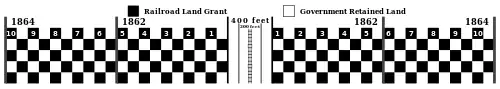 Ten square miles of land on each side of the proposed rail track were granted for every one mile of completed railway. The PLSS was utilized for measurement. Every one-mile length of railway completed was akin to a section. If the railway ran predominantly east and west, a 10-mile (16 km) range of one square mile sections was allotted on each side of the 400-foot (120 m) right-of-way. If the railway ran predominantly north and south, a 10-mile (16 km) township of one square mile sections was allotted on each side of the 400-foot (120 m) right-of-way. The land was granted in alternating sections (one square mile), with each odd numbered section going to the railroad company and each even numbered section kept by the government. This created a checkerboard pattern along proposed railway. This was supposed to guarantee that railroad access would increase the value of both the railroad-granted sections and the government-owned sections in the checkerboard. The system was devised by Senator Stephen A. Douglas, with political support from Senator Jefferson Davis.[5]