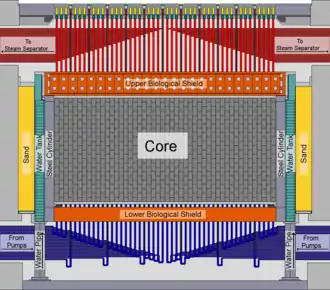 The moderator is surrounded by a cylindrical water tank, a welded structure with 3 cm (1.2 in) thick walls, an inner diameter of 16.6 m (54 ft 6 in) and an outer diameter of 19 m (62 ft 4 in), internally divided to 16 vertical compartments. The water is supplied to the compartments from the bottom and removed from the top; the water can be used for emergency reactor cooling. The tank contains thermocouples for sensing the water temperature and ion chambers for monitoring the reactor power.[10] The tank, sand layer, and concrete of the reactor pit serve as additional biological shields.