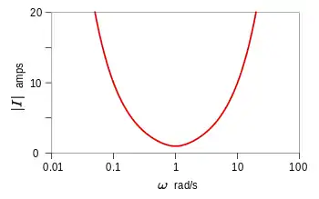 There is a peak value of |I(jω)|. The value of ω at this peak is, in this particular case, equal to the undamped natural resonance frequency:[17]