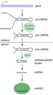 The majority of miRNAs act in the cytoplasm and mediate mRNA degradation or translational arrest.[30] However, some plant miRNAs have been shown to act directly to promote DNA methylation.[31] miRNAs come from hairpin precursors generated by the RNaseIII enzymes Drosha and Dicer.[32] Both miRNA and siRNA form either the RNA-induced silencing complex (RISC) or the nuclear form of RISC known as RNA-induced transcriptional silencing complex (RITS).[33] The volume of literature on miRNA within the framework of RNAi is extensive.
