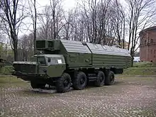 The missile is deployed in a Transporter Erector Launcher (TEL) canister mounted on cross-country 7-axle chassis on a mobile launch vehicle. The chassis incorporates jacks, gas and hydraulic drives and cylinders, with a power of several hundred tons, for jacking and leveling of the launcher, speeding up (combat) and slowing down (maintaining) elevation of the container with the missile in the vertical position. The TEL is accompanied by a Mobile command post, carrying support facilities mounted on cross-country 4-axle chassis with unified vans. The complex is equipped with an onboard inertial navigation system which gives the TEL group the capability to conduct the launch independently from its field deployment sites. This topo-geodesic support and navigation subsystem, created by the "Signal" Research Institute, provides a quick and highly precise tie-in of the launcher in a field position and enables its crew to carry out missile launches from any combat patrol route point. The launch can also be carried out at regimental bases from the aforementioned garrison garage.