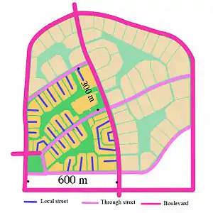 The design is typified by the backyards of homes facing the street and the fronts of homes facing one another, over common yards.[1][2] It is an offshoot of American designs from the English garden city movement and culminated in the design of the partly-built 1929 Radburn estate.[3]