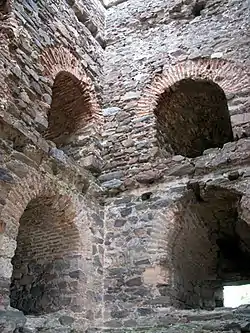 Is not known when the original city was built, but it certainly is one of the oldest forts in this region. The Ottomans didn't demolish the Roman mausoleum, instead they built the fortress around it.[11] This, for the major part, allowed for the older remains to survive in relatively good shape until today.[10] Sultan Bayazid II built the present fortifications in the form of an irregular pentagon with the maximum length of 35 m (115 ft) and width of 25 m (82 ft), designed to withstand cannon warfare. The city consists of 5 towers at four levels (three floors and the ground level), three on the east and two on the western rampart. Apart from the place, where the fortress is entered, there are four corner towers. The side towards and fort are surrounded by a low wall and wide dry moat in front of it. City entrance is at the keep tower (donžon), which is located in the southwestern side of the fort. The towers have different bases, but are projected in regular pattern and built in the similar architectural conception. On the first floors of each tower there were cannon embrasures.[2] The walls are 2 to 3.3 m (6 ft 7 in to 10 ft 10 in) thick. In order to prevent easy capture of the fortress, the upper floors could be reached only via the each tower's gate or the outer stairs.[10]