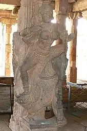 Rati (Sanskrit: रति, Rati) is the Hindu goddess of love, carnal desire, lust, passion and sexual pleasure.[1][2][3][4] Usually described as the daughter of Prajapati Daksha, Rati is the female counterpart, the chief consort and the assistant of Kama (Kamadeva), the god of love. A constant companion of Kama, she is often depicted with him in legend and temple sculpture. She also enjoys worship along with Kama.