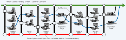 The components of RMS are CNC machines,[8] reconfigurable machine tools,[4][6] reconfigurable inspection machines[9] and material transport systems (such as gantries and conveyors) that connect the machines to form the system. Different arrangements and configurations of these machines will affect the system's productivity.[10] A collection of mathematical tools, which are defined as the RMS science base, may be utilized to maximize system productivity with the smallest possible number of machines.