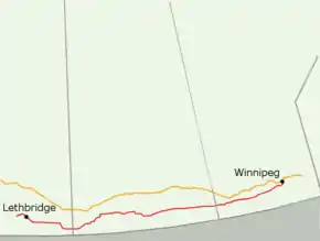 In Saskatchewan, Highway 13 is designated as Red Coat Trail. The travel corridor from the Manitoba—Saskatchewan border to Winnipeg follows Manitoba PTH 2.[nb 1][1]
