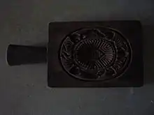 Red tortoise cake molds are an important tool when making red tortoise cakes. Apart from molding the red tortoise cakes into perfectly round or oval shapes, these molds are also used to imprint patterns onto the surfaces of the red tortoise cakes. Usually carved out of wood or molded from plastics, there are many different types of red tortoise cake molds available on the market.[6] There are also red tortoise molds that create floral patterns instead of the tortoise shell pattern seen on traditional red tortoise cakes. These molds are used to enhance the aesthetic value of red tortoise cakes and there is no cultural significance attached to the differing designs on these molds.