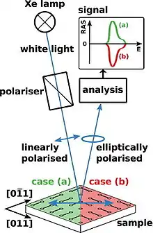 Reflectance difference spectroscopy (RDS) is a spectroscopic technique which measures the difference in reflectance of two beams of light that are shone in normal incident on a surface with different linear polarizations.[2] It is also known as reflectance anisotropy spectroscopy (RAS).[3]