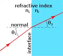 When light moves from one medium to another, it changes direction, i.e. it is refracted. If it moves from a medium with refractive index n1 to one with refractive index n2, with an incidence angle to the surface normal of θ1, the refraction angle θ2 can be calculated from Snell's law:[33]
