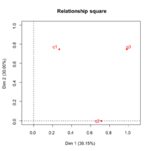 In statistics, the relationship square is a graphical representation for use in the factorial analysis of a table individuals x variables. This representation completes classical representations provided by principal component analysis (PCA) or multiple correspondence analysis (MCA), namely those of individuals, of quantitative variables (correlation circle) and of the categories of qualitative variables (at the centroid of the individuals who possess them). It is especially important in factor analysis of mixed data (FAMD) and in multiple factor analysis (MFA).