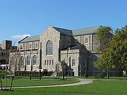 Another unique building is the Voorhees Computing Center (VCC). Originally the St. Joseph's Seminary chapel, it was built in 1933 and acquired by Rensselaer in 1958, and after renovation served as the institute's library from 1960 until the completion of the new Folsom Library, in 1976.[43] The Folsom Library, located adjacent to the computing center, has a concrete exterior that was designed to harmonize with the light gray brick of the chapel;[44] architecturally, it is an example of the modern brutalist style.[45] Subsequently, the university was unsure of what to do with the chapel, or whether to keep it at all, but in 1979 decided to preserve it and renovate it to house computer labs and facilities to support the institute's computing initiatives. Today the VCC serves as the backbone for the institute's data and telephony infrastructure.