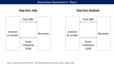 According to Yale economist Gary Gorton, repo evolved to provide large non-depository financial institutions with a method of secured lending analogous to the depository insurance provided by the government in traditional banking, with the collateral acting as the guarantee for the investor.[3]