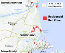 The residential red zone refers to areas of land in and around Christchurch, New Zealand, that experienced severe damage in the 2010 and 2011 Christchurch earthquakes and were deemed infeasible to rebuild on. Through voluntary buyouts, the Crown acquired and demolished or removed over 8,000 properties.[1]:5 The majority were located in a broad swath of the eastern suburbs along the Avon River / Ōtākaro that had suffered damage from soil liquefaction.