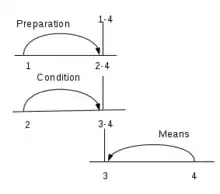 In the figure, numbers 1,2,3,4 show the corresponding units as explained above. The fourth unit and the third unit form a relation "Means". The fourth unit is the essential part of this relation, so it is called the nucleus of the relation and third unit is called the satellite of the relation. Similarly second unit to third and fourth unit is forming relation "Condition". All units are also spans and spans may be composed of more than one unit.
