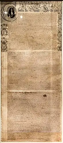 Rhode Island's General Court of Commissioners convened at Newport on 24 November 1663 for the last time under the parliamentary patent of 1643/4.[13] The inhabitants and legislators gathered to learn the result of Dr. John Clarke's decade-long efforts,[13] described in the colonial records: