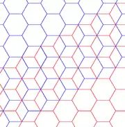 Two hexagonal tilings with red and blue edges within rhombille tiling