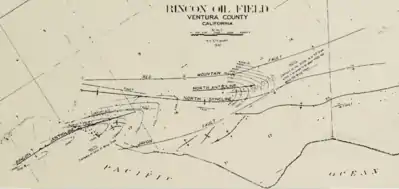 The Rincon Oil Field is a large oil field on the coast of southern California, about 10 miles (16 km) northwest of the city of Ventura, and about 20 miles (32 km) east-southeast of the city of Santa Barbara. It is the westernmost onshore field in a series of three fields which follow the Ventura Anticline, an east-west trending feature paralleling the Transverse Ranges. Discovered in 1927, the oil field is ranked 36th in California by size of recoverable oil reserves, and while mostly depleted – now having, by California Department of Conservation estimates, only about 2.5% of its original oil – it remains productive, with 77 wells active at the beginning of 2008.[1] Oil produced in the field flows through the M-143 pipeline, which parallels U.S. Highway 101 southeast to the Ventura Pump Station, at which point it joins a Tosco pipeline which carries it to Los Angeles area refineries.[2] As of 2009, the primary operators of the field were Occidental Petroleum for the onshore portion, and Greka Energy for the offshore portion. The offshore part of the field is operated mainly from Rincon Island.