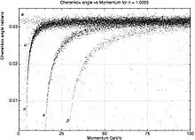 Knowledge of the particle's momentum and direction (normally available from an associated momentum-spectrometer) allows a predicted for each hypothesis of the particles type; using the known of the RICH radiator gives a corresponding prediction of that can be compared to the of the detected Cherenkov photons, thus indicating the particle's identity (usually as a probability per particle type). A typical (simulated) distribution of vs momentum of the source particle, for single Cherenkov photons, produced in a gaseous radiator (n~1.0005, angular resolution~0.6mrad) is shown in the following figure: