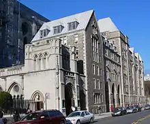 Neither Rockefeller nor Fosdick had strict requirements for the church's architectural style. Rockefeller asked for the new building to include space for the Park Avenue Baptist Church's carillon, which he had donated.[35] Most of the plans entailed a church facing 122nd Street and wrapping around the existing apartment buildings on the site. The exception was a plan by Allen & Collens and Henry C. Pelton—who had designed Park Avenue Baptist Church—that called for a Gothic Revival church with its main entrance on the side, facing Riverside Drive, with a bell tower and apartment towers for the neighboring Union Theological Seminary.[40] The building committee removed the apartment towers from the church plan and Allen, Collens, and Pelton were selected to design the new church in February 1926.[30][40][41] As part of the plans, there would be a 375-foot (114 m)—later 392-foot (119 m)—bell tower, a 2,400-seat auditorium, and athletic rooms. The building would occupy a 100 feet (30 m) by 225 feet (69 m) lot.[30][41] There was no room for a chapel in the original plans so Rockefeller proposed trading land with the Union Theological Seminary. In May 1926, Rockefeller gave Union an apartment building on 99 Claremont Avenue, to the northeast of the church. In exchange, Riverside Church received a small plot to its south, allowing for the construction of the chapel and a proposed cloister passage to Claremont Avenue.[42]