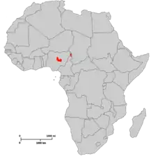 It was first believed that rock firefinches were only endemic to the Jos Plateau in central Nigeria, but observations were also reported in northern Cameroon, which borders eastern Nigeria. Rock firefinches are considered to be range-restricted, since they are mostly found in the Jos Plateau. The Jos Plateau is a rocky habitat with a semi-temperate climate with temperatures ranging from 60-80 degrees Fahrenheit. There is a distinct dry season from November to April and rainy season from May to October.[4] Rock firefinches prefer inselbergs in bush savannah habitats and rocky outputs to build their nests in.[5] Inselbergs are isolated hills or mountains that arise from a flat plain. Regardless of the season, rock firefinches live in inselbergs and avoid farmland areas. Rock firefinches have high site fidelity, habitually returning to the same area throughout the whole year.[4] During the dry season, rock firefinches have larger home ranges as a result of traveling to gallery forests to attain water. During the wet season, rock firefinches do not need to travel to distant water resources and therefore have a smaller home range.